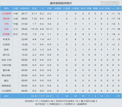 阅读:0 次发布时间:2026-04-21 11:51:09北京时间4月16日,NBA附加赛:魔术97-109不敌76人,将跟黄蜂争夺东部最后一个季后赛名额。魔术状元班凯罗被保罗-乔治锁死,此役班凯罗22投7中,三分5中0,罚球6中4,得到18分5板4助1帽6失误,正负值-17全场最低。